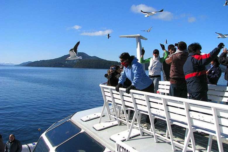 Nos encontraremos en el lugar que elijáis entre las 8:00 y las 8:30 horas. Nos dirigiremos a la península Llao Llao, localizada a 30 minutos de Bariloche. La primera parada será Puerto Pañuelo, donde abordaremos un catamarán para navegar una hora por el lago Nahuel Huapi.
