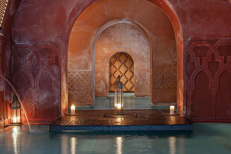 El Hammam ofrece un entorno donde se unen arquitectura arabesca, aire perfumado, música andalusí y luz tenue para revitalizar cuerpo y mente. La experiencia incluye un baño de hora y media con acceso a tres salas de agua a diferentes temperaturas. Se aconseja iniciar en la sala templada (36º) para adaptar la temperatura corporal, luego pasar a la sala caliente (40º) y descansar en la sala fría (18º C). La experiencia se completa con un té verde con menta en la sala de relajación.