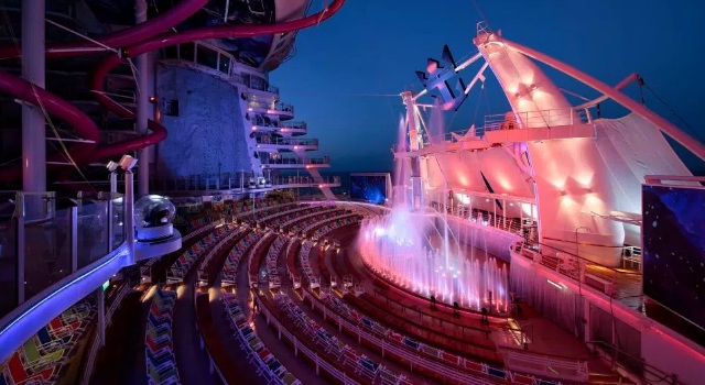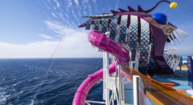 Zona Deportiva y de Piscinas con parque acuático H2O Zone para niños, 4 piscinas y 10 jacuzzis, tranquila área de solárium junto a la piscina, 2 simuladores de surf Flowrider, canchas deportivas, minigolf y una emocionante vista del barco y el mar desde la tirolina, solarium Bistro, Café y bar Wipe Out.