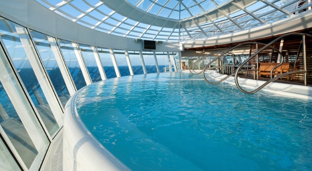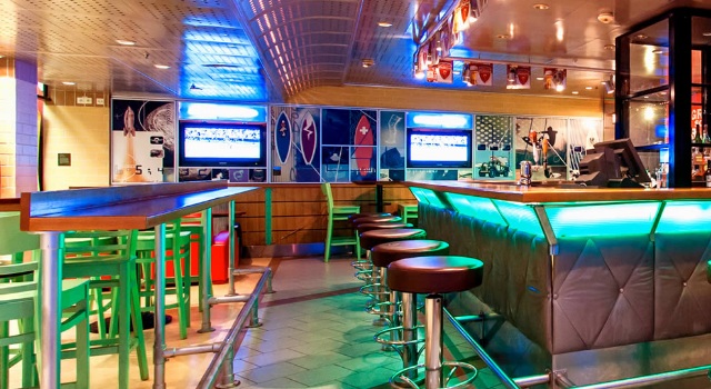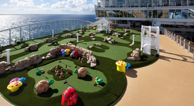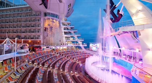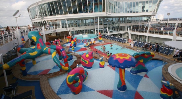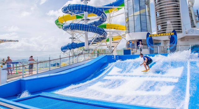 Zona Deportiva y de Piscinas con parque acuático H2O Zone para niños, 4 piscinas y 10 jacuzzis, tranquila área de solárium junto a la piscina, 2 simuladores de surf Flowrider, canchas deportivas, minigolf y una emocionante vista del barco y el mar desde la tirolina, solarium Bistro, Café y bar Wipe Out.